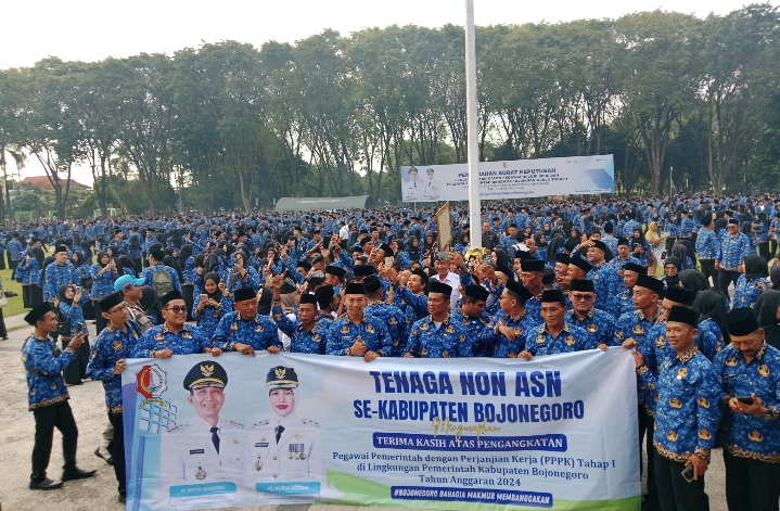 News Bojonegoro – Pemerintah Kabupaten Bojonegoro resmi melantik 3.129 Calon Pegawai Negeri Sipil (CPNS) dan Calon Pegawai Pemerintah dengan Perjanjian Kerja (CPPPK) di Alun-alun Bojonegoro. Kamis (30/4/2025). Pelantikan tersebut menandai berakhirnya proses seleksi ASN tahun 2024.