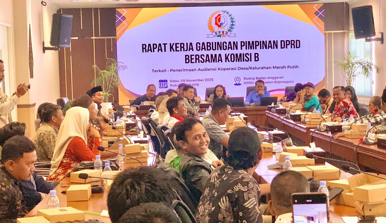 News Bojonegoro — Komisi B DPRD Kabupaten Bojonegoro menggelar audiensi bersama perwakilan Koperasi Desa/Kelurahan Merah Putih (KDKMP) se-Kabupaten Bojonegoro di ruang Banggar DPRD, Selasa (4/11/2025). Pertemuan ini dihadiri oleh pimpinan dan anggota Komisi B, Asisten Daerah II, Dinas Koperasi, Usaha Mikro dan Perdagangan (Disdagkop-UM), Bappeda, Dekopinda, perwakilan bank-bank Himbara, serta pengurus KDKMP dari berbagai kecamatan.