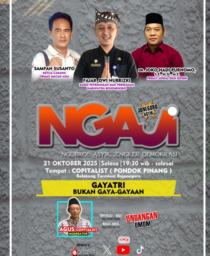 NewsBojonegoro.com – Komunitas Dewan Jegrank kembali menggelar diskusi rutin bertajuk Ngaji (Ngobrol Asyik Jengker Demokrasi) yang kali ini mengusung tema “Gayatri Bukan Gaya-Gayaan.” Kegiatan tersebut akan dilaksanakan pada Selasa, 21 Oktober 2025 mulai pukul 19.30 WIB di Copitalist (Pondok Pinang), yang berlokasi di belakang Terminal Bojonegoro.