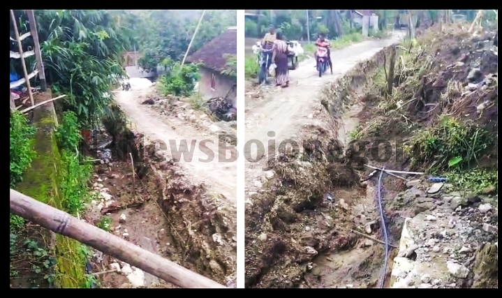Dari pantauan di lokasi, terlihat galian memanjang di sisi jalan dengan kondisi terbuka tanpa tanda pengaman. Di dalamnya tampak pipa saluran yang belum tertutup sempurna, sementara sebagian badan jalan terlihat rusak dan becek akibat tanah galian yang longsor. Kondisi ini membuat warga yang melintas, baik pejalan kaki maupun pengendara motor, harus ekstra hati-hati agar tidak terpeleset atau terperosok ke dalam lubang.